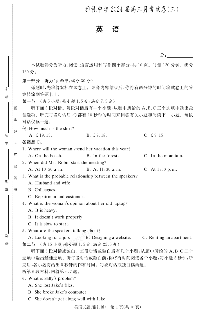 湖南省长沙市雅礼中学2024届高三上学期月考试题(三)英语