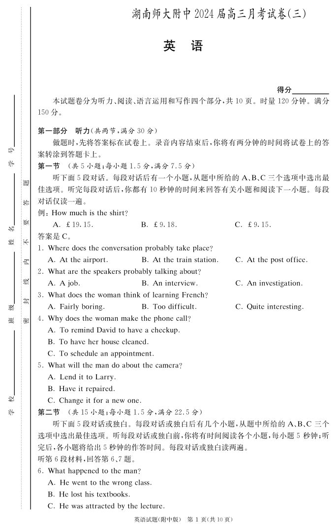 湖南省师范大学附属中学2024届高三上学期月考(三)英语