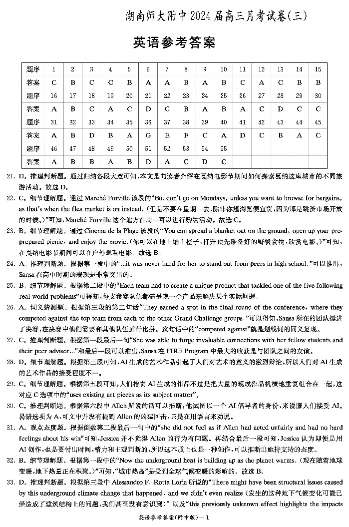 湖南省师范大学附属中学2024届高三上学期月考(三)英语答案