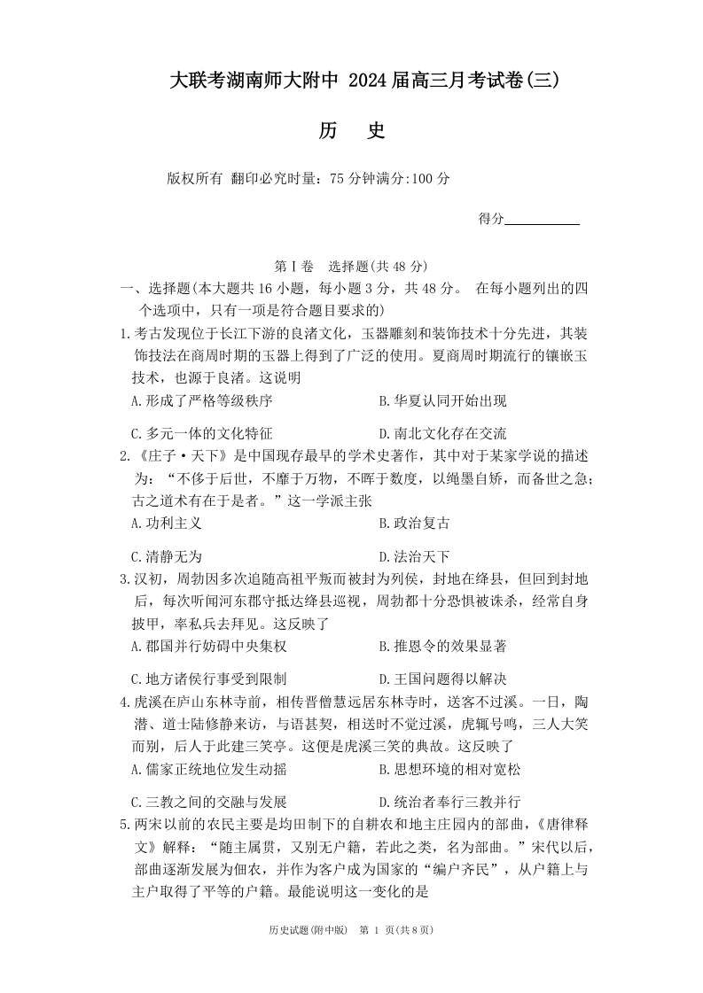 湖南省师范大学附属中学2024届高三上学期月考(三)历史