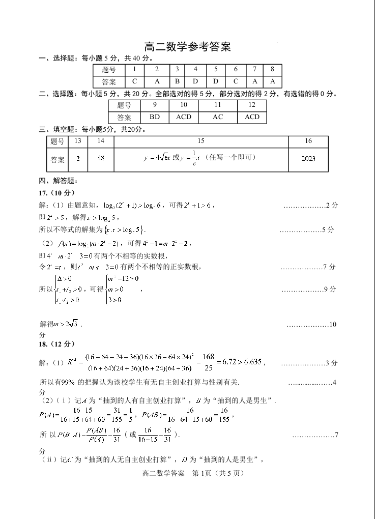 山东省威海市2024届下学期期末考试数学答案