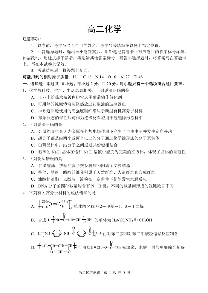 山东省威海市2024届下学期期末考试化学