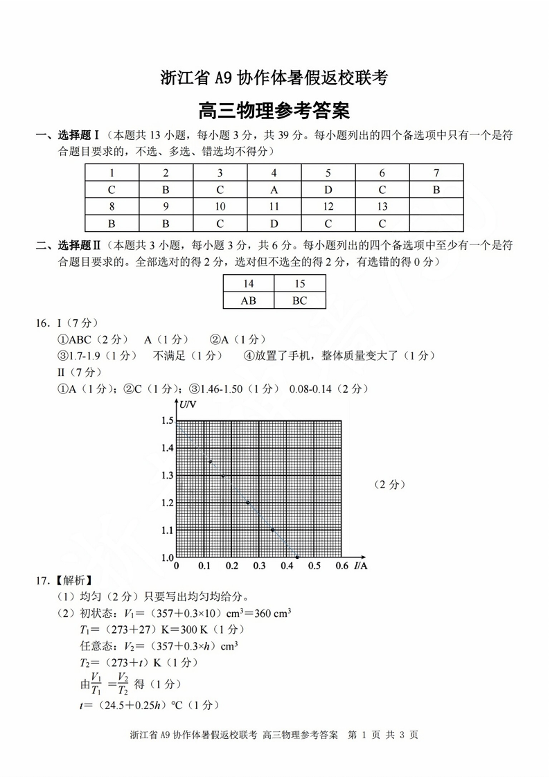 浙江省A9协作体2024届高三上学期暑假返校联考物理答案