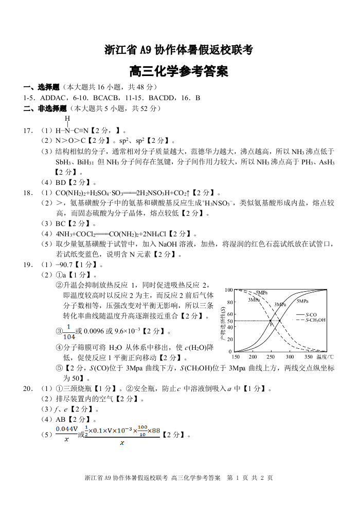浙江省A9协作体2024届高三上学期暑假返校联考化学答案