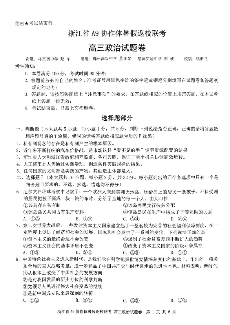 浙江省A9协作体2024届高三上学期暑假返校联考政治