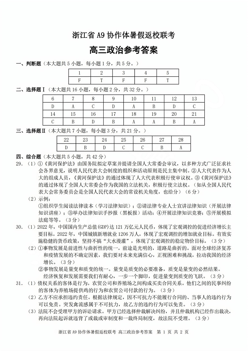 浙江省A9协作体2024届高三上学期暑假返校联考政治答案
