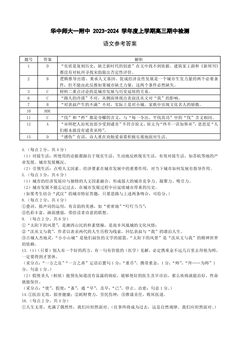 湖北省华中师范大学第一附属中学2024届高三上学期11月期中语文答案