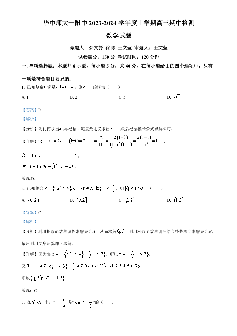 湖北省华中师范大学第一附属中学2024届高三上学期11月期中数学(解析版)