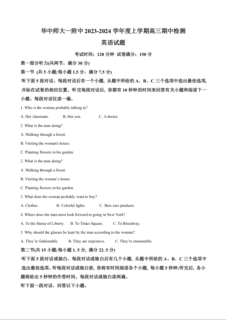 湖北省华中师范大学第一附属中学2024届高三上学期11月期中英语(解析版)