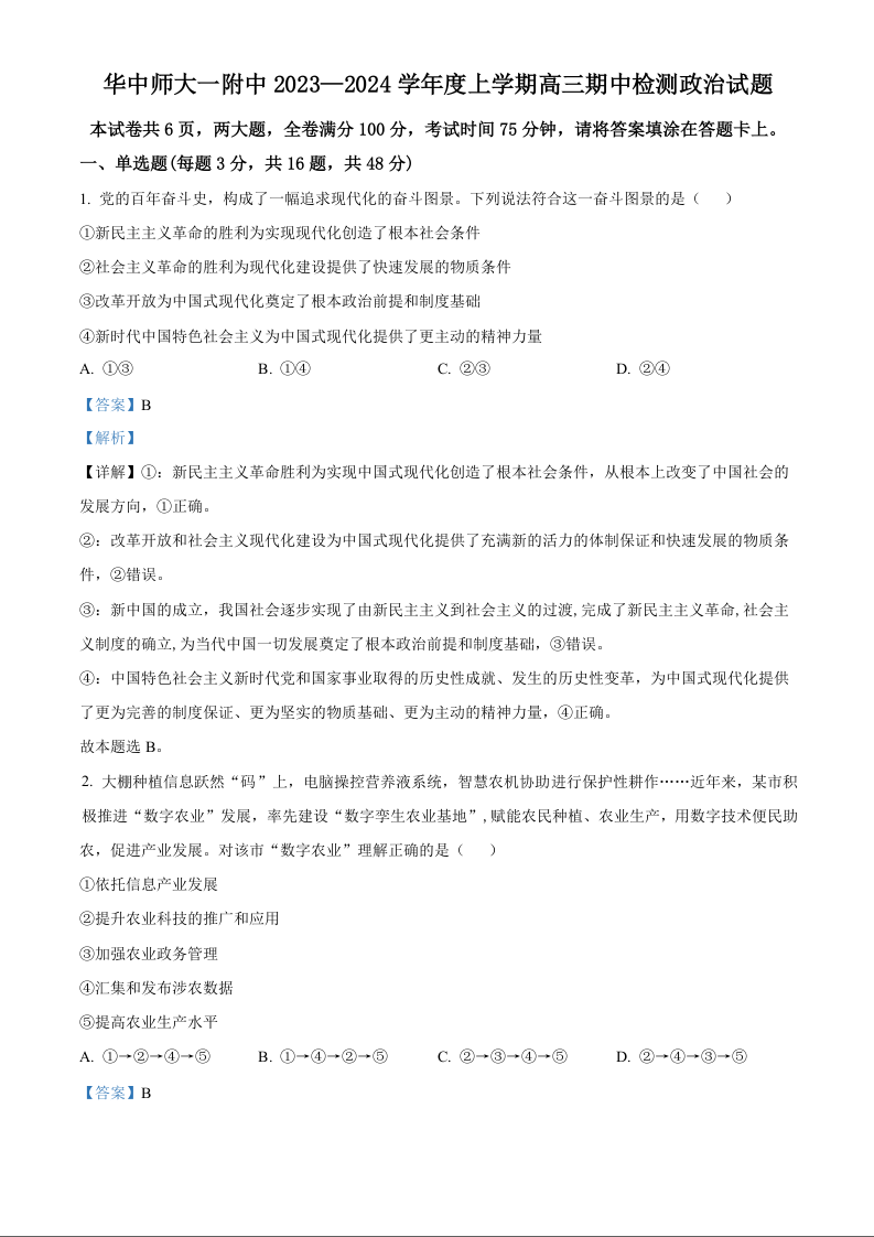 湖北省华中师范大学第一附属中学2024届高三上学期11月期中政治(解析版)