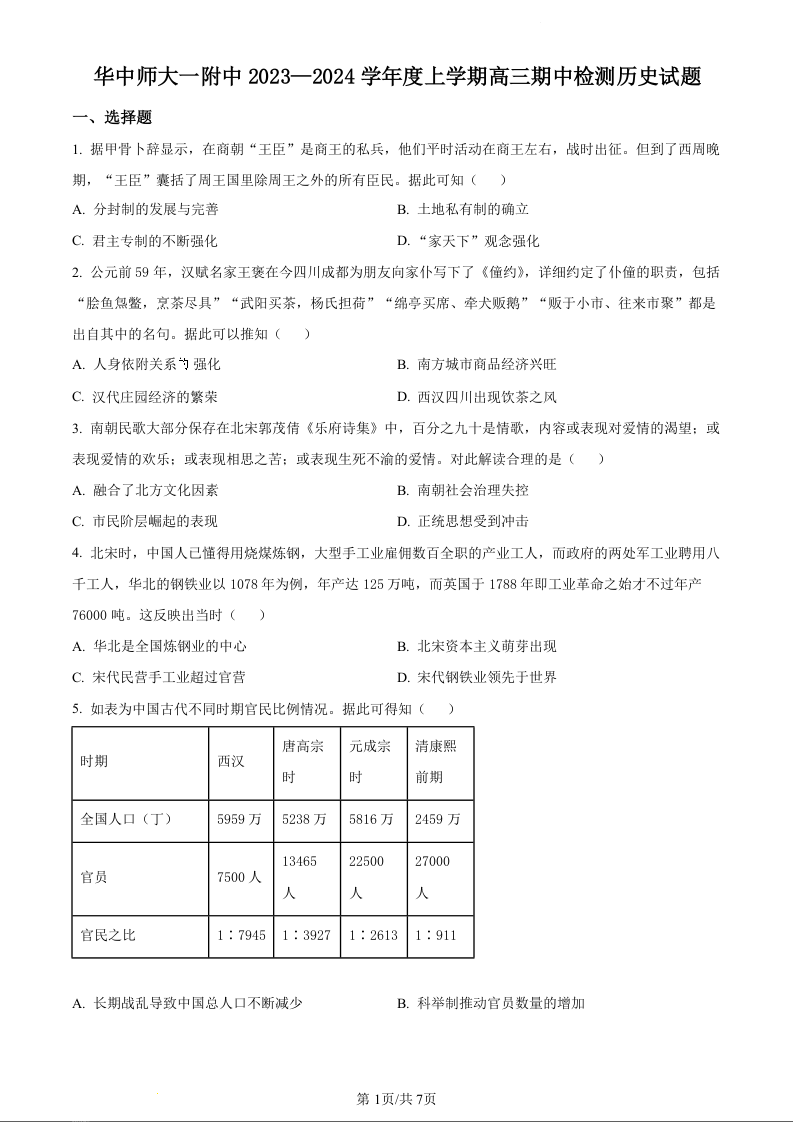 湖北省华中师范大学第一附属中学2024届高三上学期11月期中历史(原卷版)