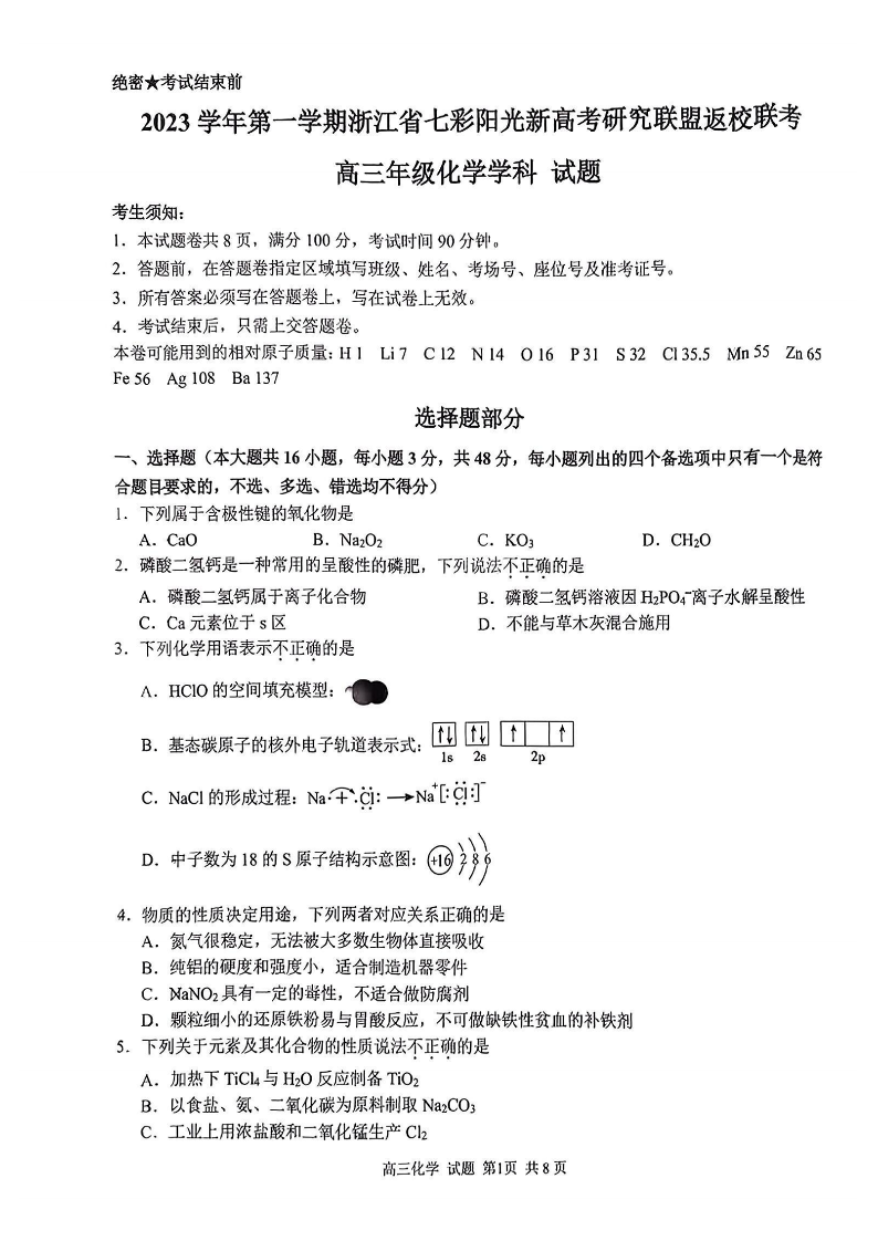 浙江省七彩阳光新高考研究联盟2024届高三上学期返校联考化学
