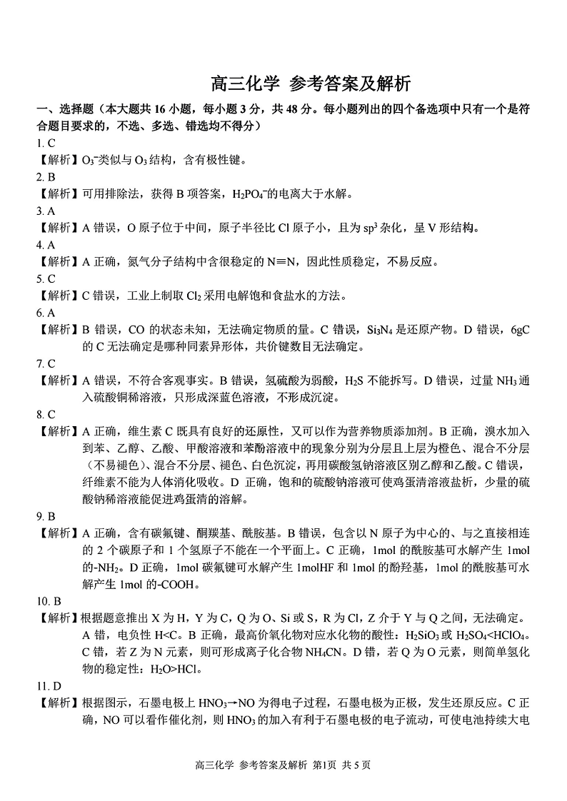 浙江省七彩阳光新高考研究联盟2024届高三上学期返校联考化学答案