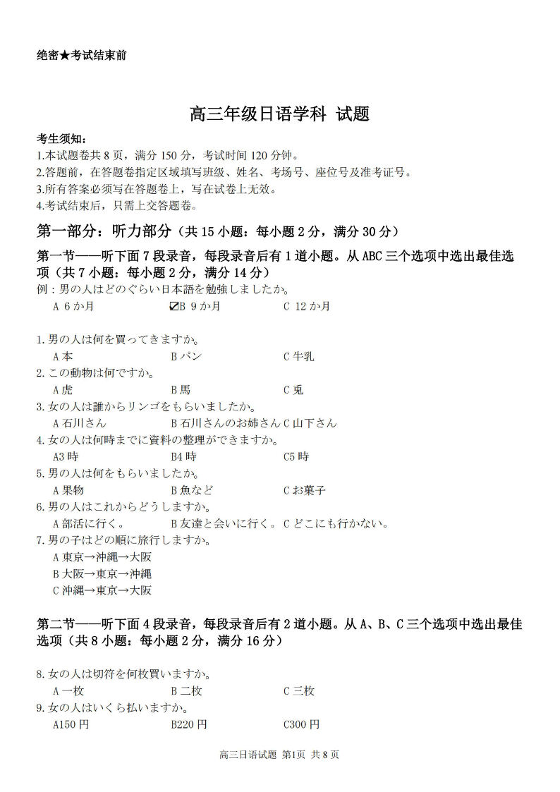浙江省七彩阳光新高考研究联盟2024届高三上学期返校联考日语