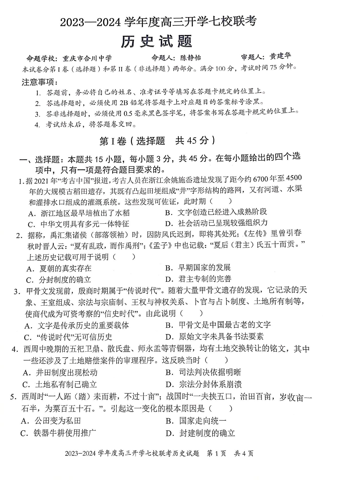 重庆市七校2024届高三上学期开学考试历史
