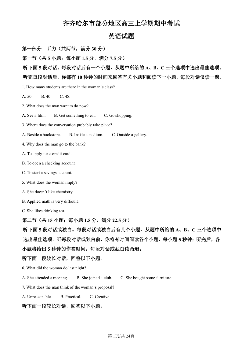 黑龙江省齐齐哈尔市普高联谊校2024届高三上学期期中考试英语(精品解析版)