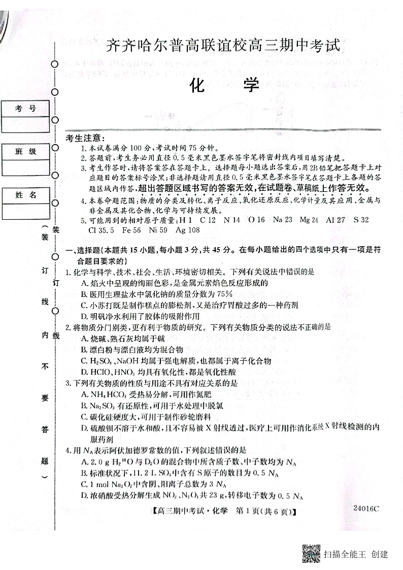 黑龙江省齐齐哈尔市普高联谊校2024届高三上学期期中考试化学