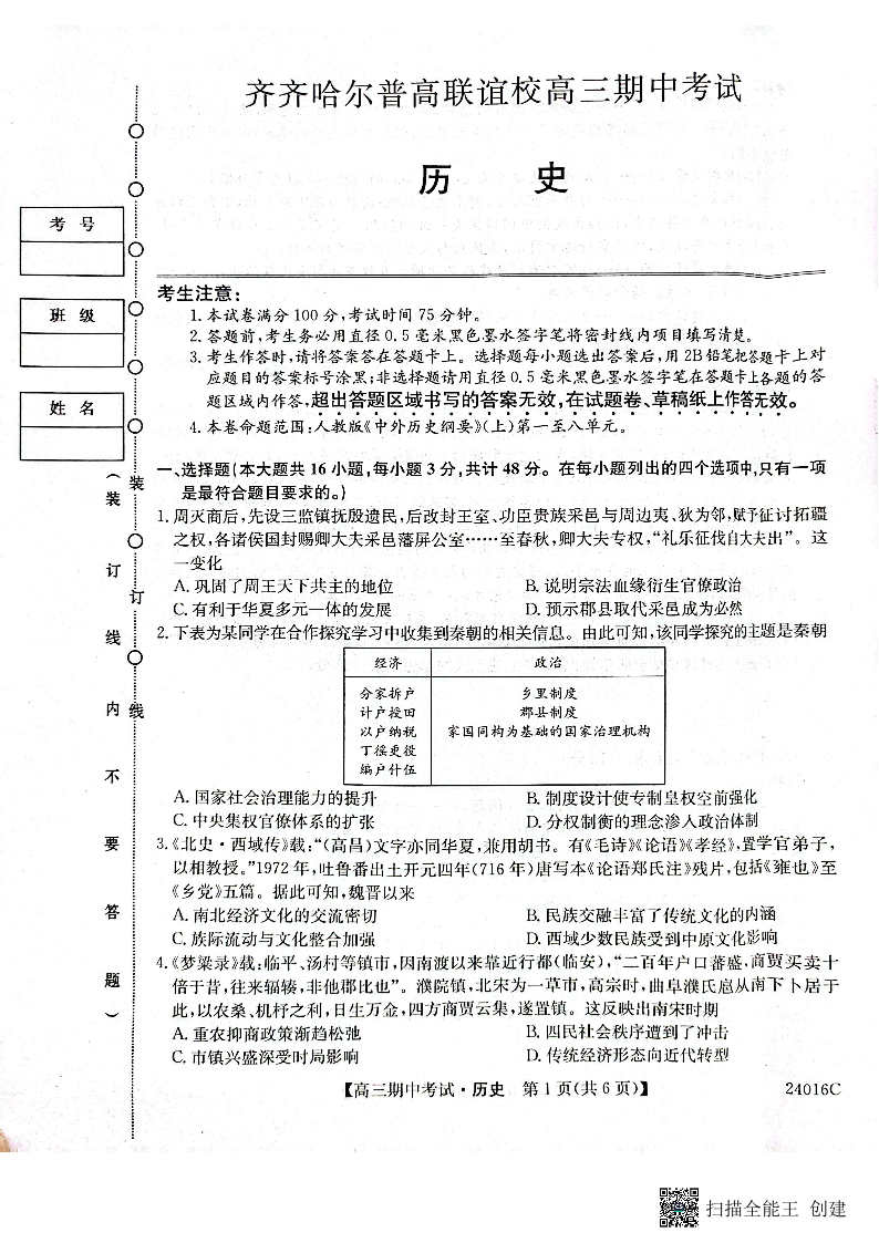 黑龙江省齐齐哈尔市普高联谊校2024届高三上学期期中考试历史