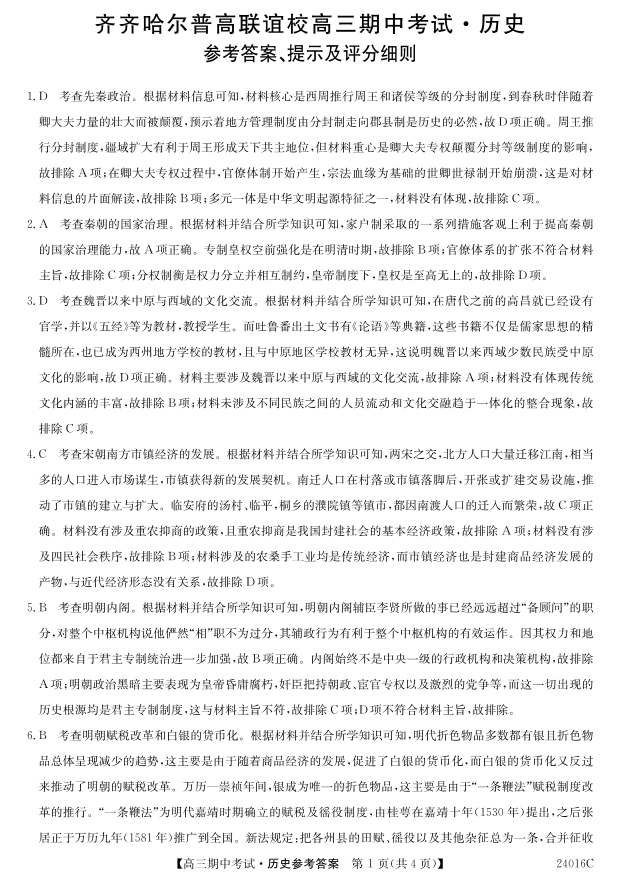 黑龙江省齐齐哈尔市普高联谊校2024届高三上学期期中考试历史答案