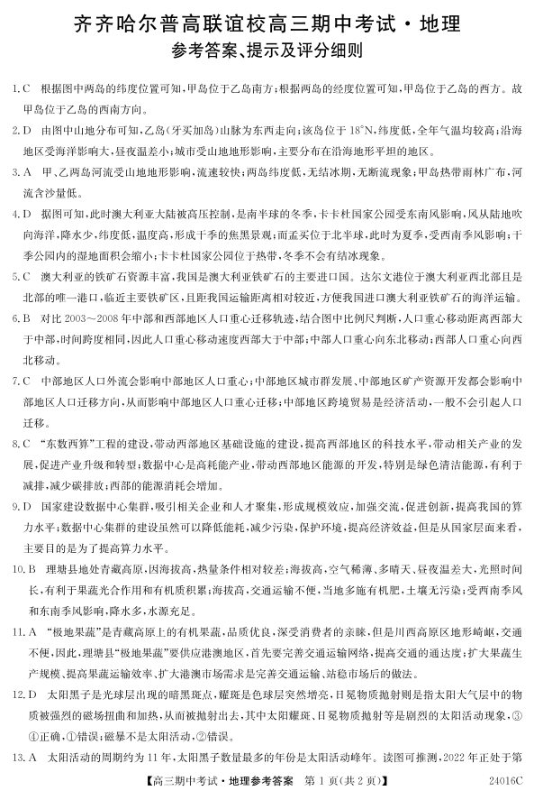 黑龙江省齐齐哈尔市普高联谊校2024届高三上学期期中考试地理答案