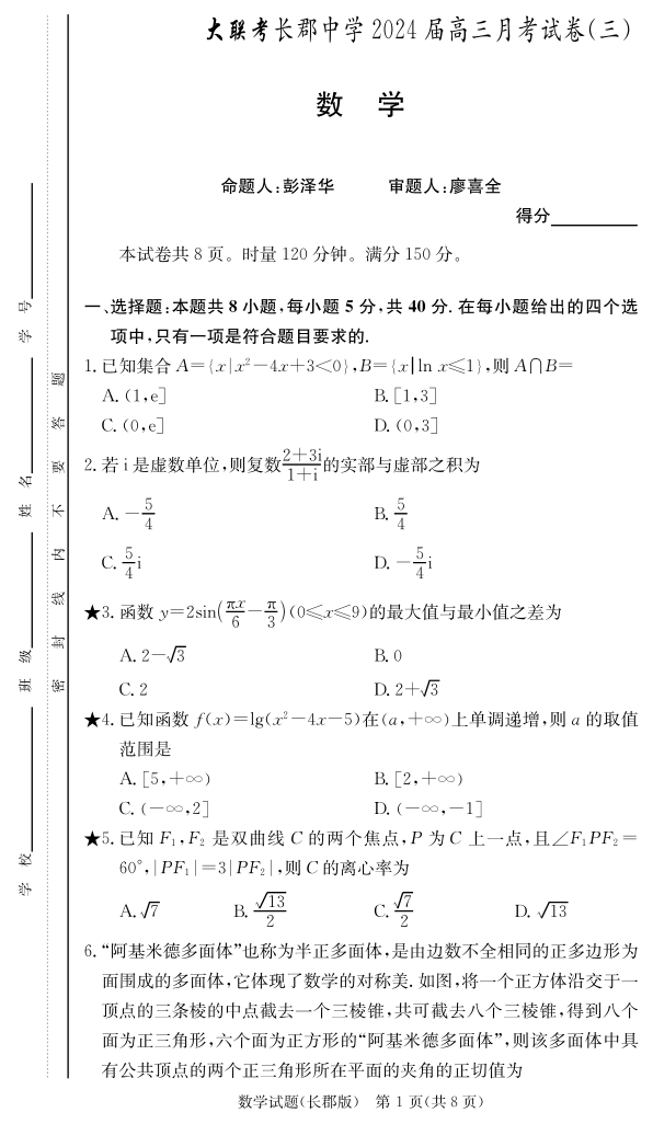 湖南省长沙市长郡中学2024届高三上学期月考(三)数学