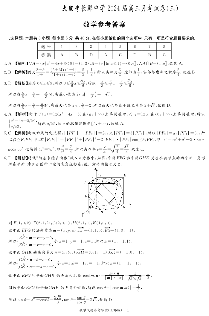 湖南省长沙市长郡中学2024届高三上学期月考(三)数学答案