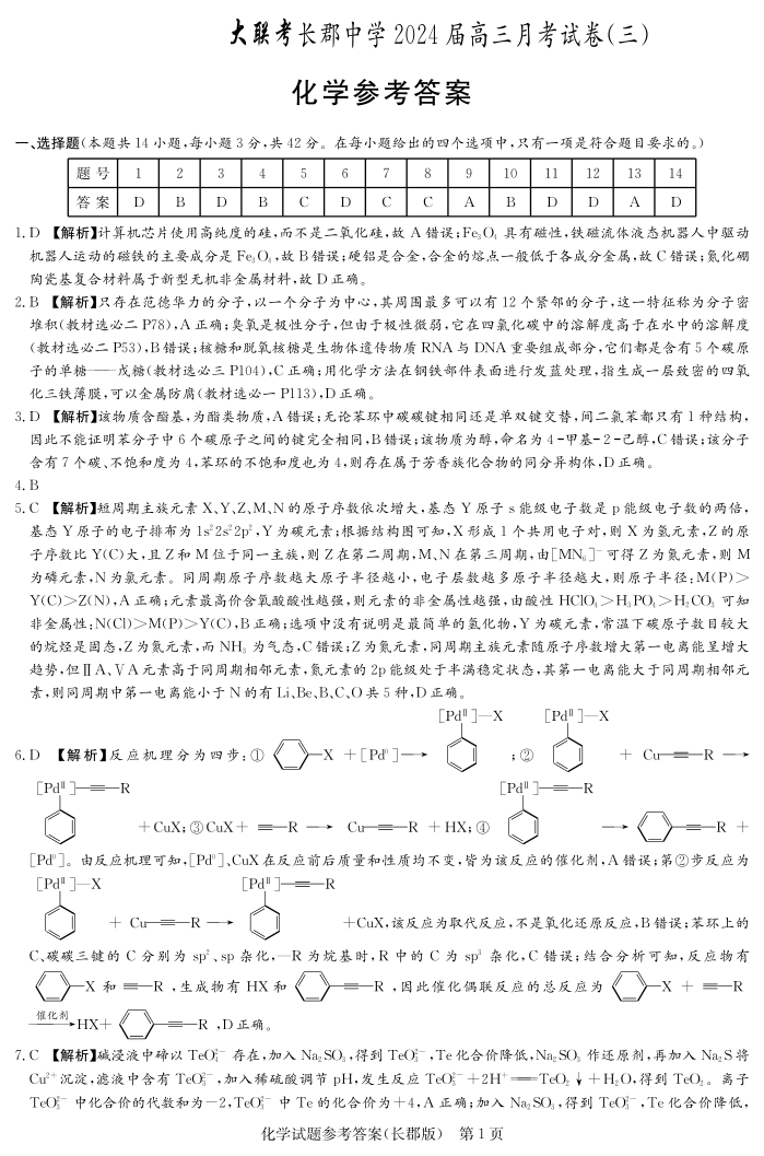 湖南省长沙市长郡中学2024届高三上学期月考(三)化学答案