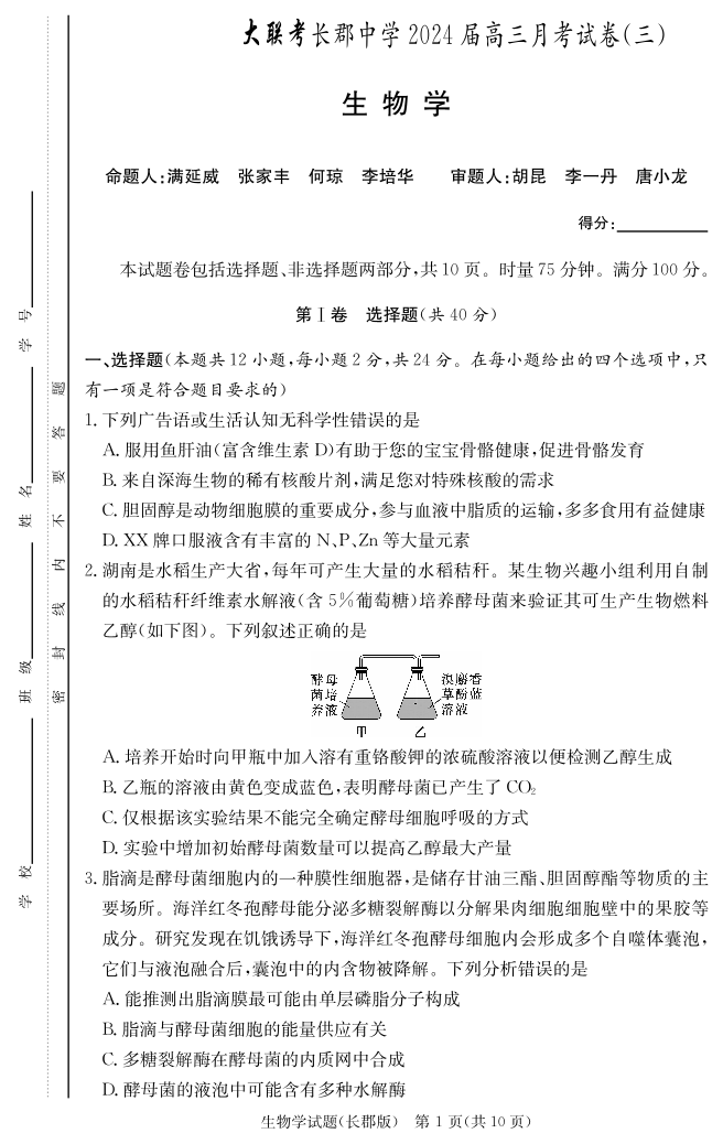 湖南省长沙市长郡中学2024届高三上学期月考(三)生物