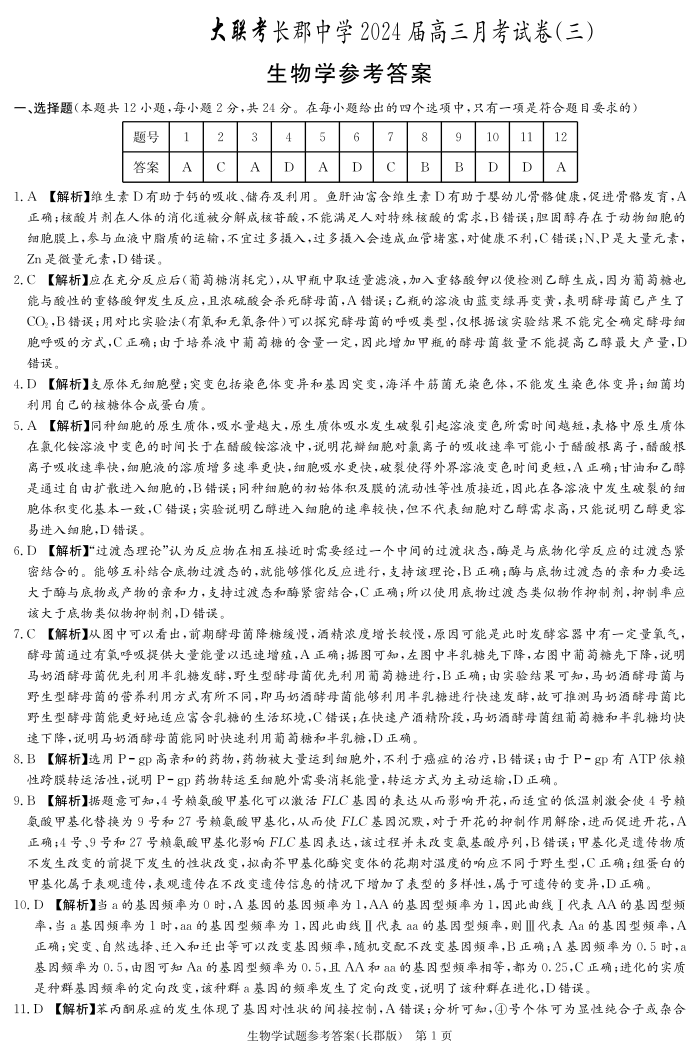 湖南省长沙市长郡中学2024届高三上学期月考(三)生物答案