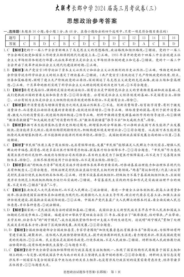 湖南省长沙市长郡中学2024届高三上学期月考(三)政治答案