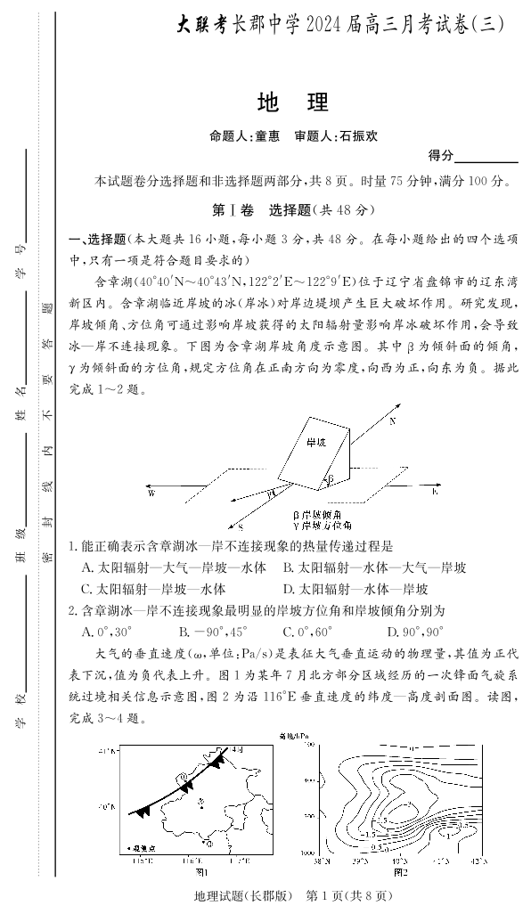湖南省长沙市长郡中学2024届高三上学期月考(三)地理