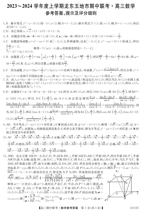 黑龙江省龙东五地市2024届高三上学期期中联考数学答案