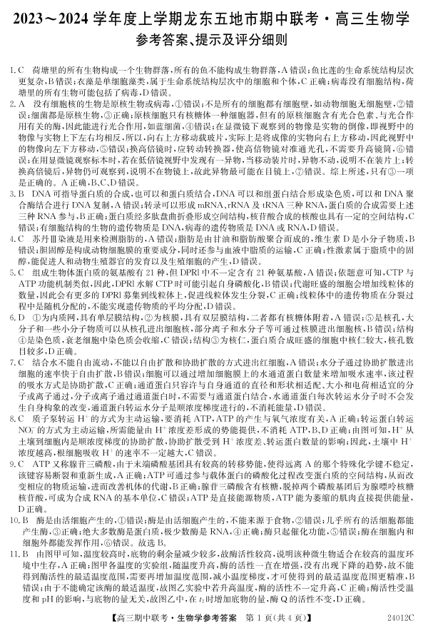 黑龙江省龙东五地市2024届高三上学期期中联考生物答案