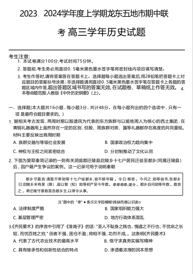 黑龙江省龙东五地市2024届高三上学期期中联考历史