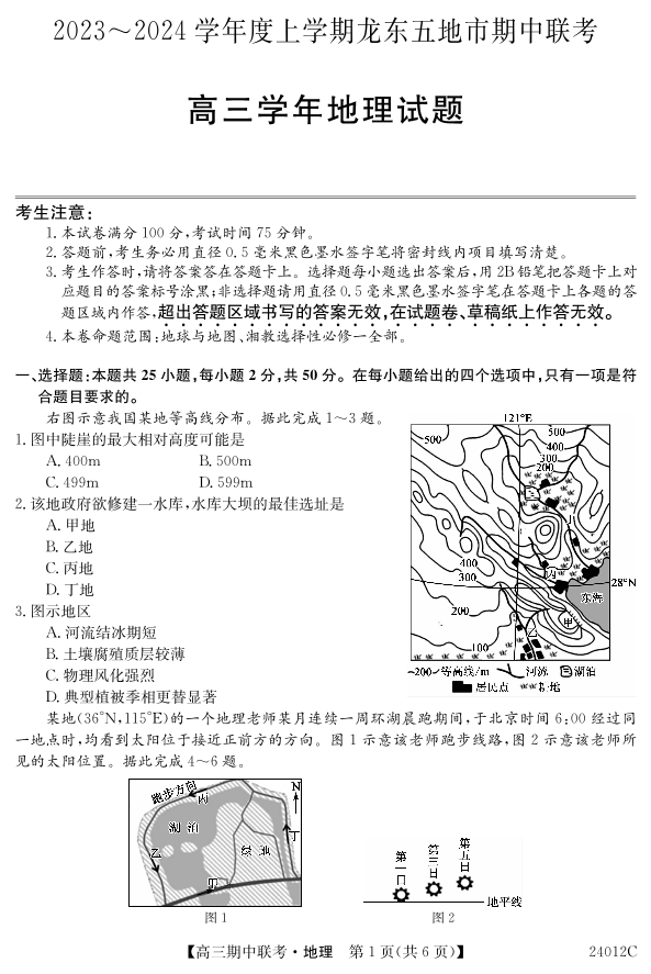 黑龙江省龙东五地市2024届高三上学期期中联考地理