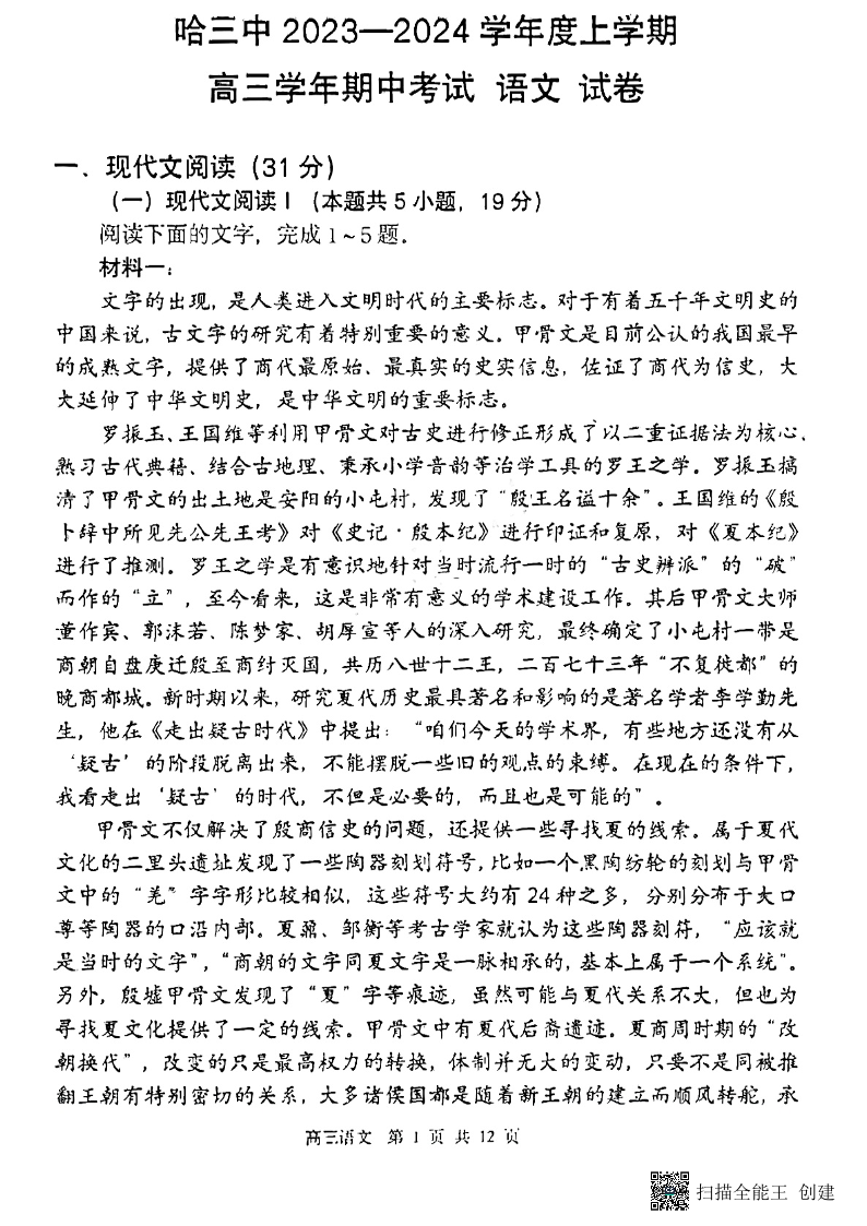 黑龙江省哈尔滨市第三中学校2024届高三上学期期中语文