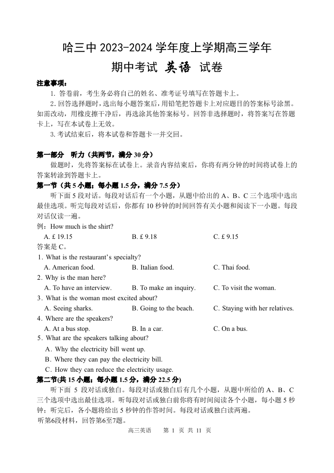 黑龙江省哈尔滨市第三中学校2024届高三上学期期中英语