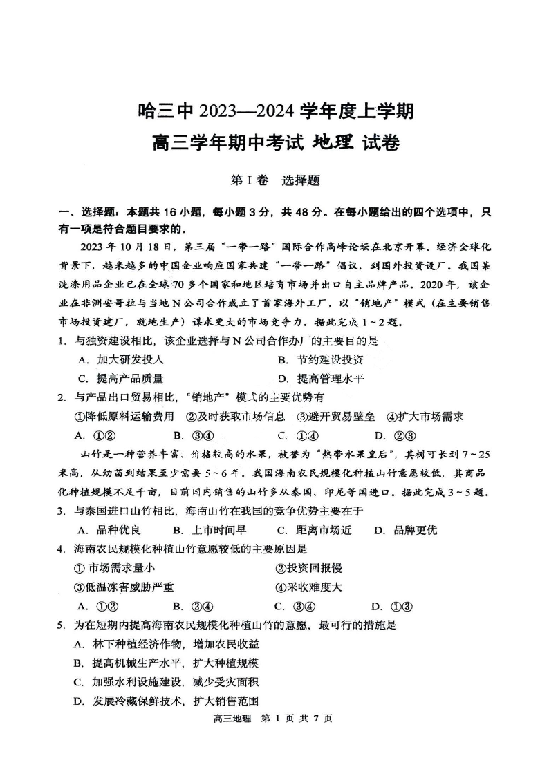 黑龙江省哈尔滨市第三中学校2024届高三上学期期中地理+答案