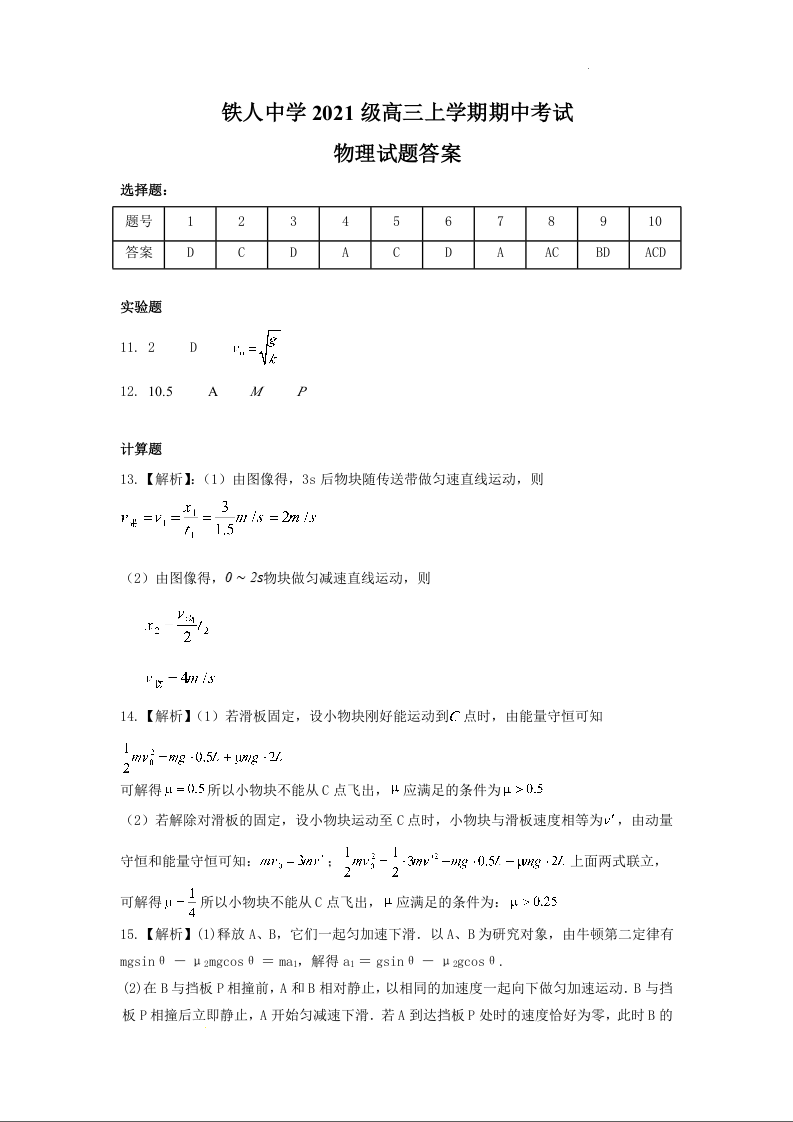 黑龙江省大庆铁人中学2024届高三上学期期中考试物理答案
