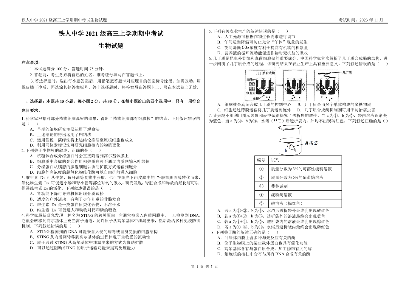 黑龙江省大庆铁人中学2024届高三上学期期中考试生物