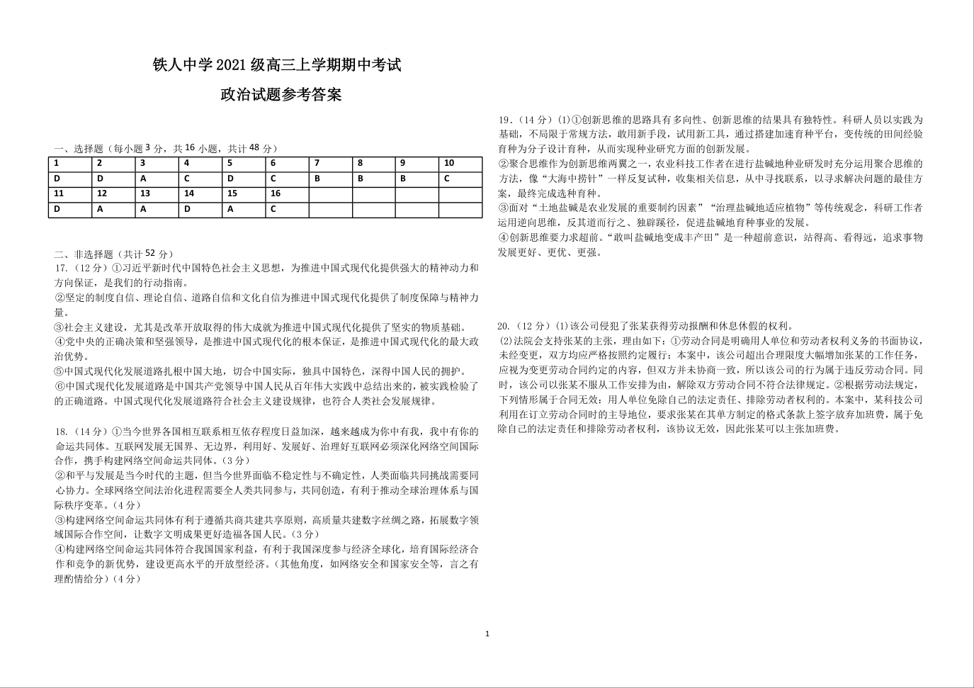 黑龙江省大庆铁人中学2024届高三上学期期中考试政治答案