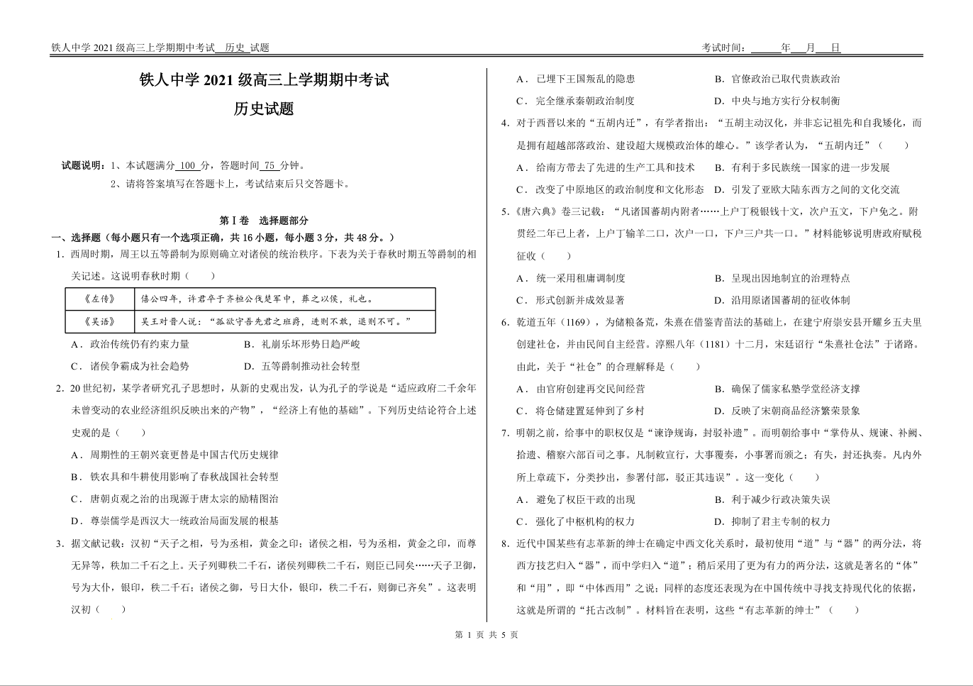 黑龙江省大庆铁人中学2024届高三上学期期中考试历史