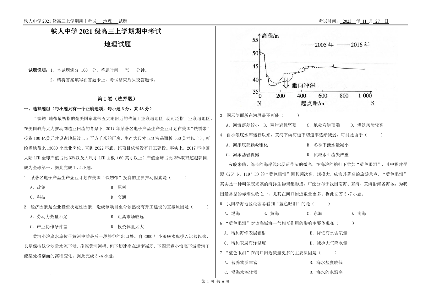 黑龙江省大庆铁人中学2024届高三上学期期中考试地理