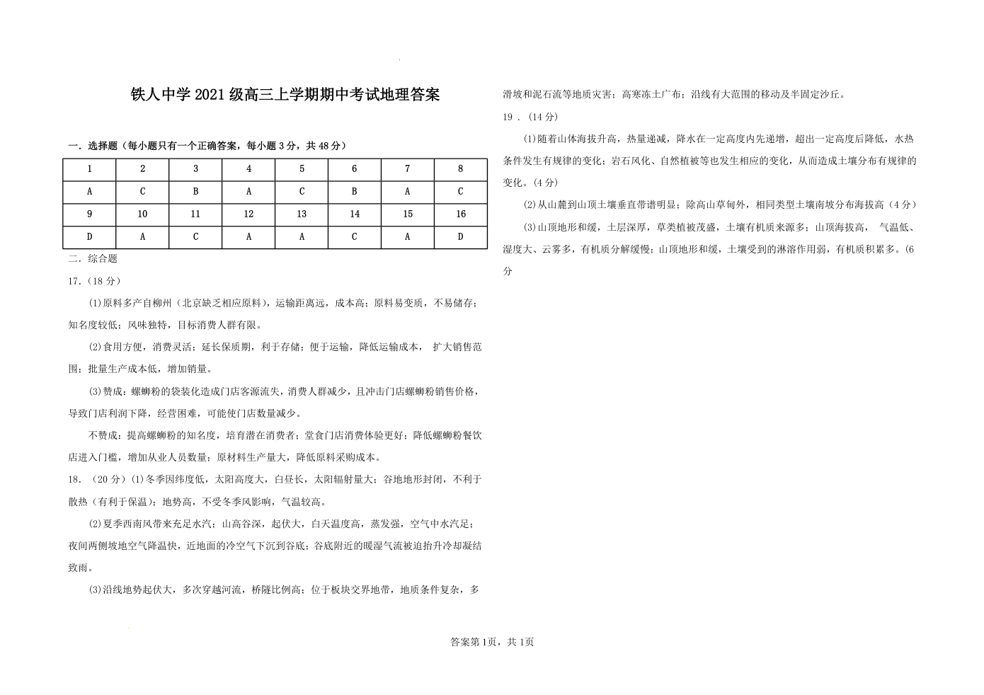 黑龙江省大庆铁人中学2024届高三上学期期中考试地理答案