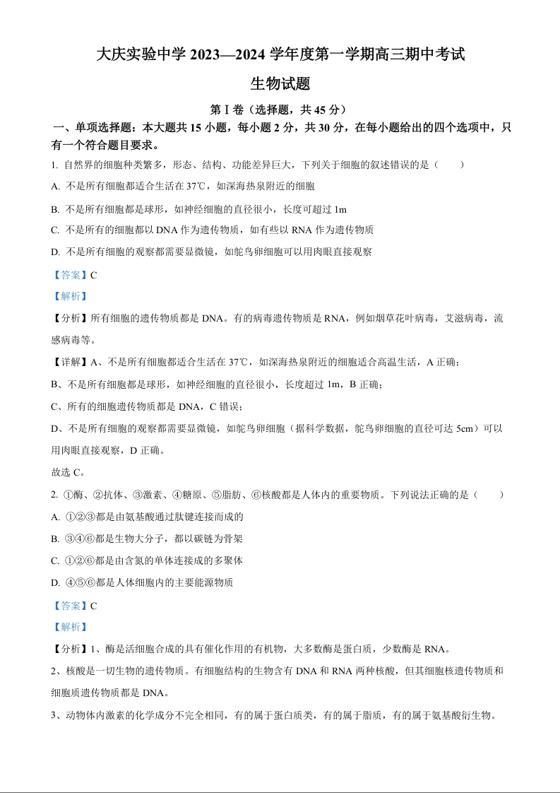 黑龙江省大庆实验中学2024届高三上学期期中考试生物(精品解析版)