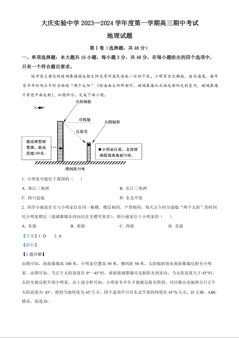 黑龙江省大庆实验中学2024届高三上学期期中考试地理(精品解析版)