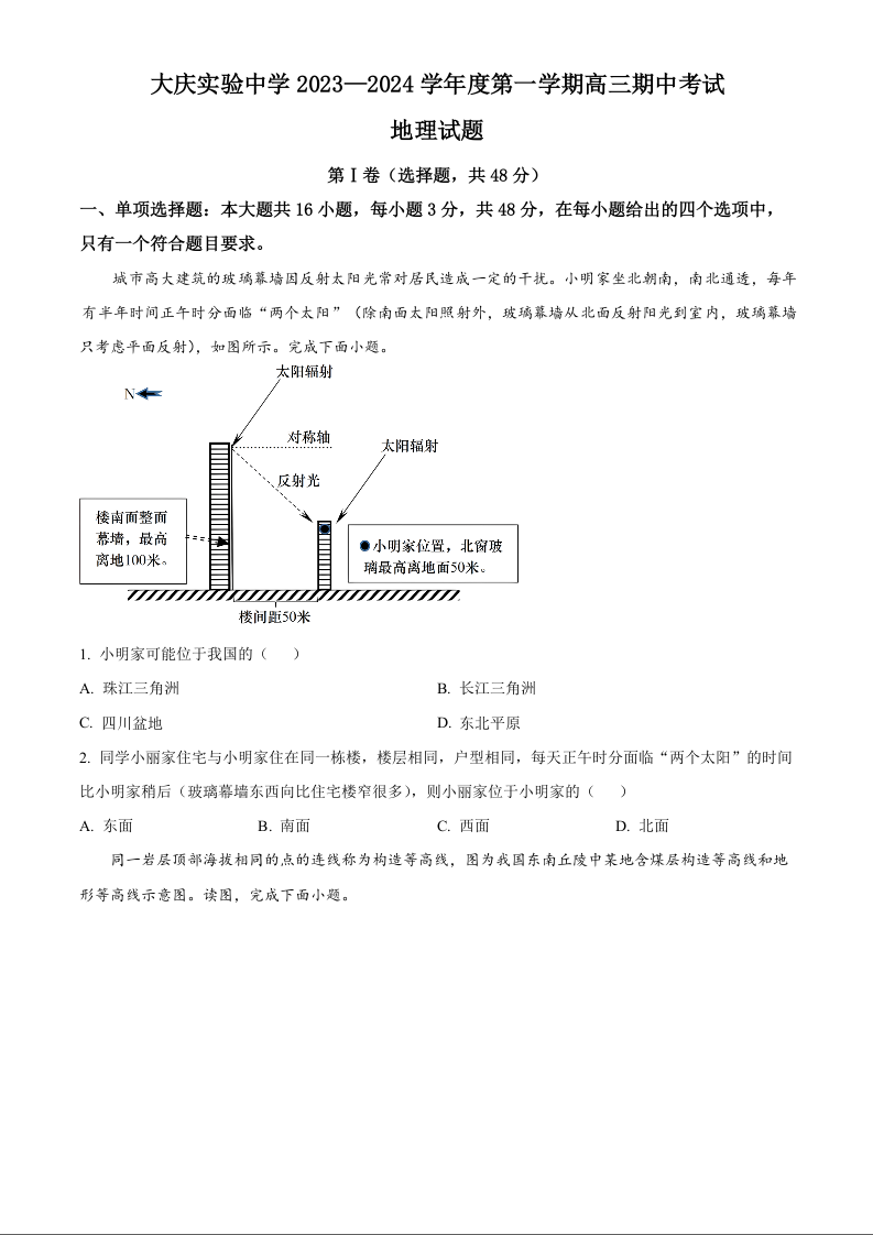 黑龙江省大庆实验中学2024届高三上学期期中考试地理(原卷版)