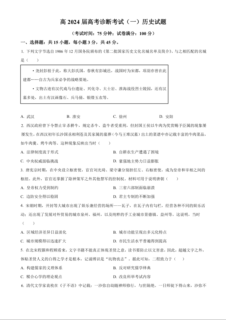 重庆市巴南区2024届高三上学期诊断考试(一模)历史(原卷版)