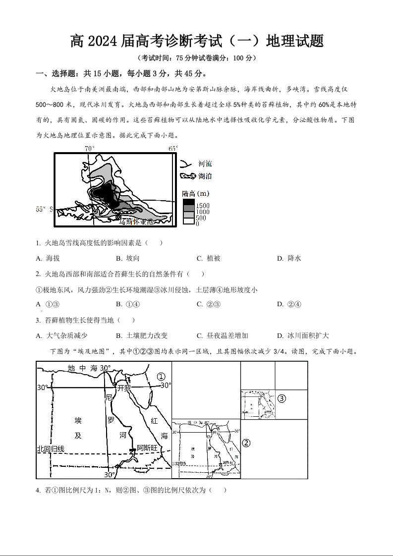 重庆市巴南区2024届高三上学期诊断考试(一模)地理(原卷版)