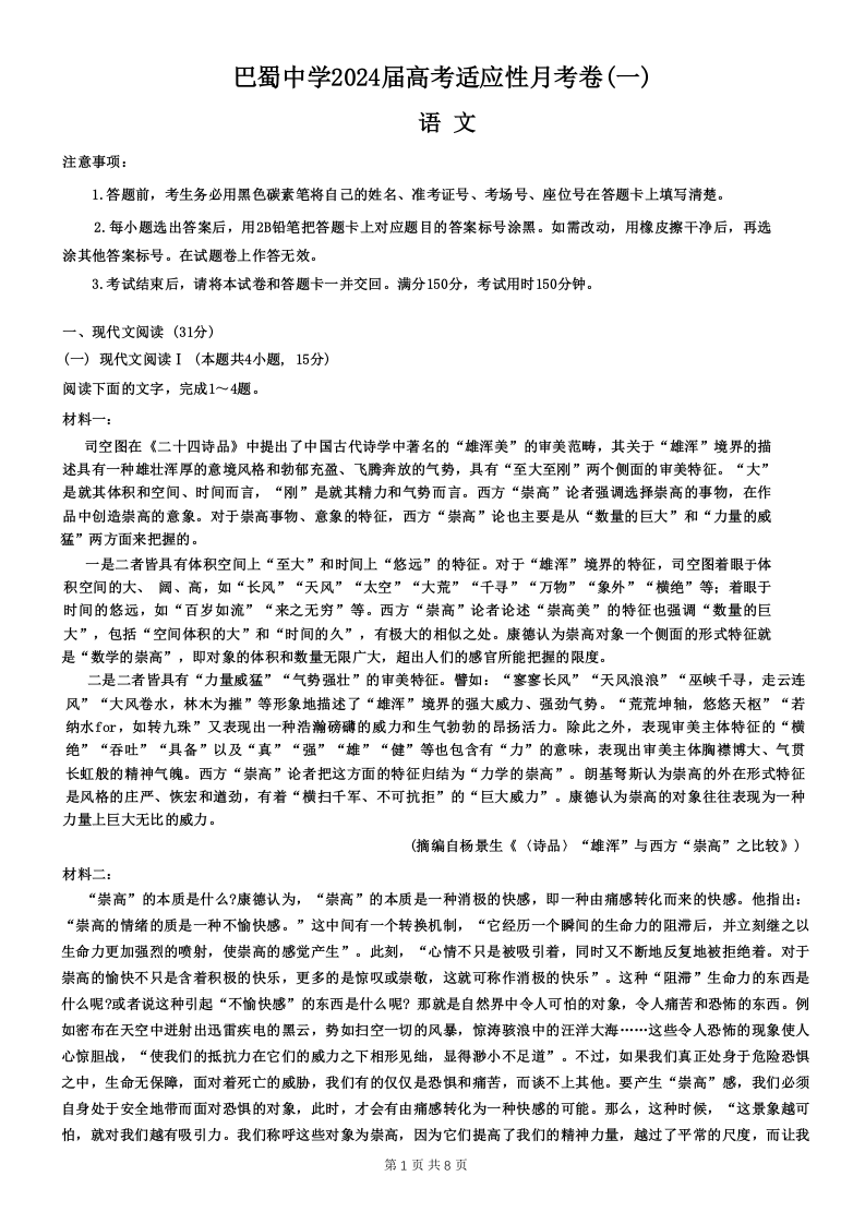 重庆市巴蜀中学2024届高考适应性月考卷(一)语文